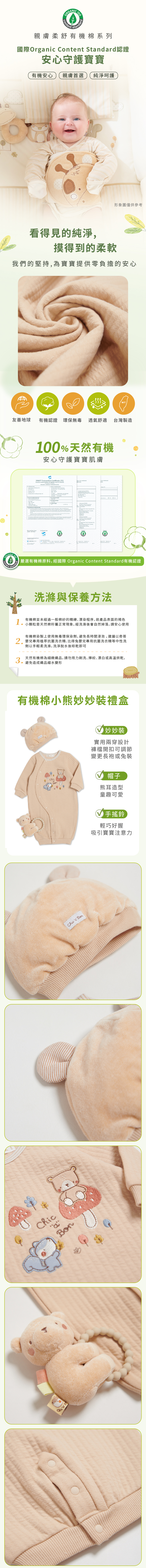 有機棉小熊妙妙裝/連身衣3件組禮盒 (妙妙裝+帽子+手搖鈴)