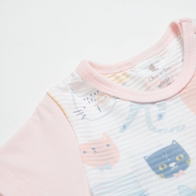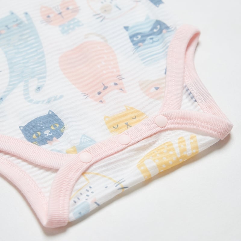 萌貓樂園短袖側開包屁衣 (天絲橫紋單面布)
