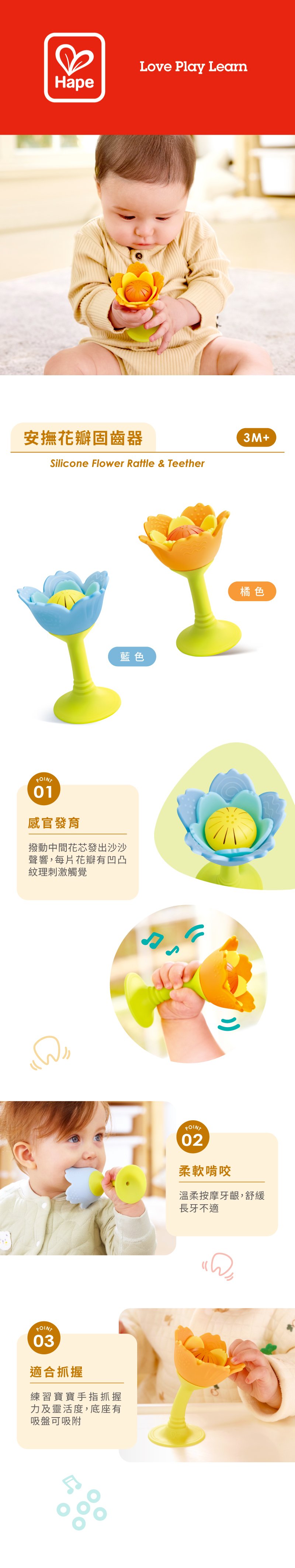 花瓣上的不同圖案有助於寶寶的觸覺發育。